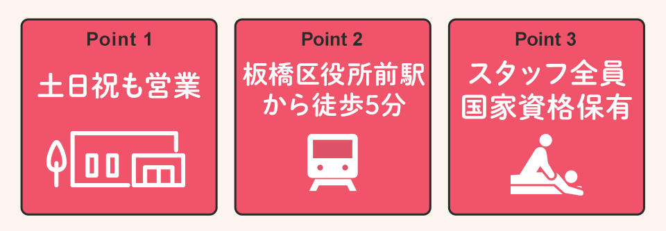 当院は板橋区役所前駅にある、再発しない身体づくりに特化した整体院です。痛みの原因を突き止め、動ける喜びを取り戻すお手伝いをいたします。
